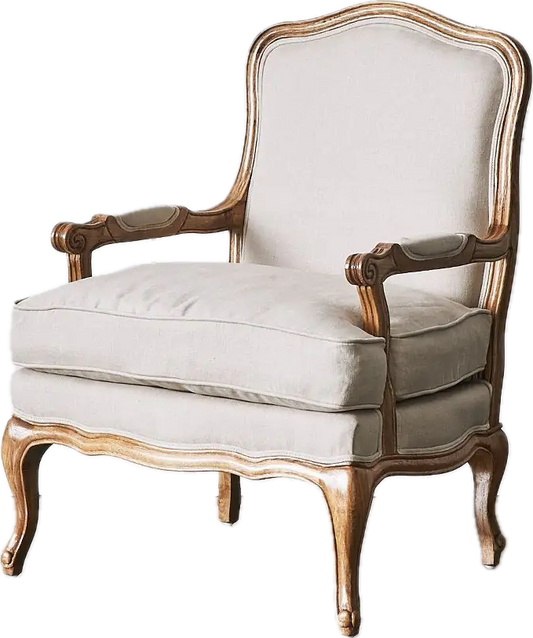 A FRENCH LOUIS XV STYLE OAK ARMCHAIR WITH MATCHING OTTOMAN, UPHOLSTERED IN NATURAL LINEN, CHAIR 70 x 45cm, OTTOMAN 50 x 25cm.