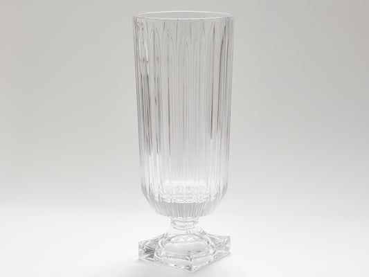 A PAIR OF CRYSTAL HURRICANE LAMPS WITH SQUARE FOOTED BASE, HEIGHT 31cm.
