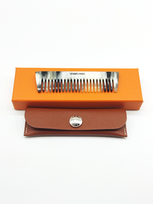 HERMÈS, HORN COMB WITH SWIFT CALFSKIN CASE & CLOU DE SELLE SNAP CLOSURE, LENGTH 10cm, WITH BOX.