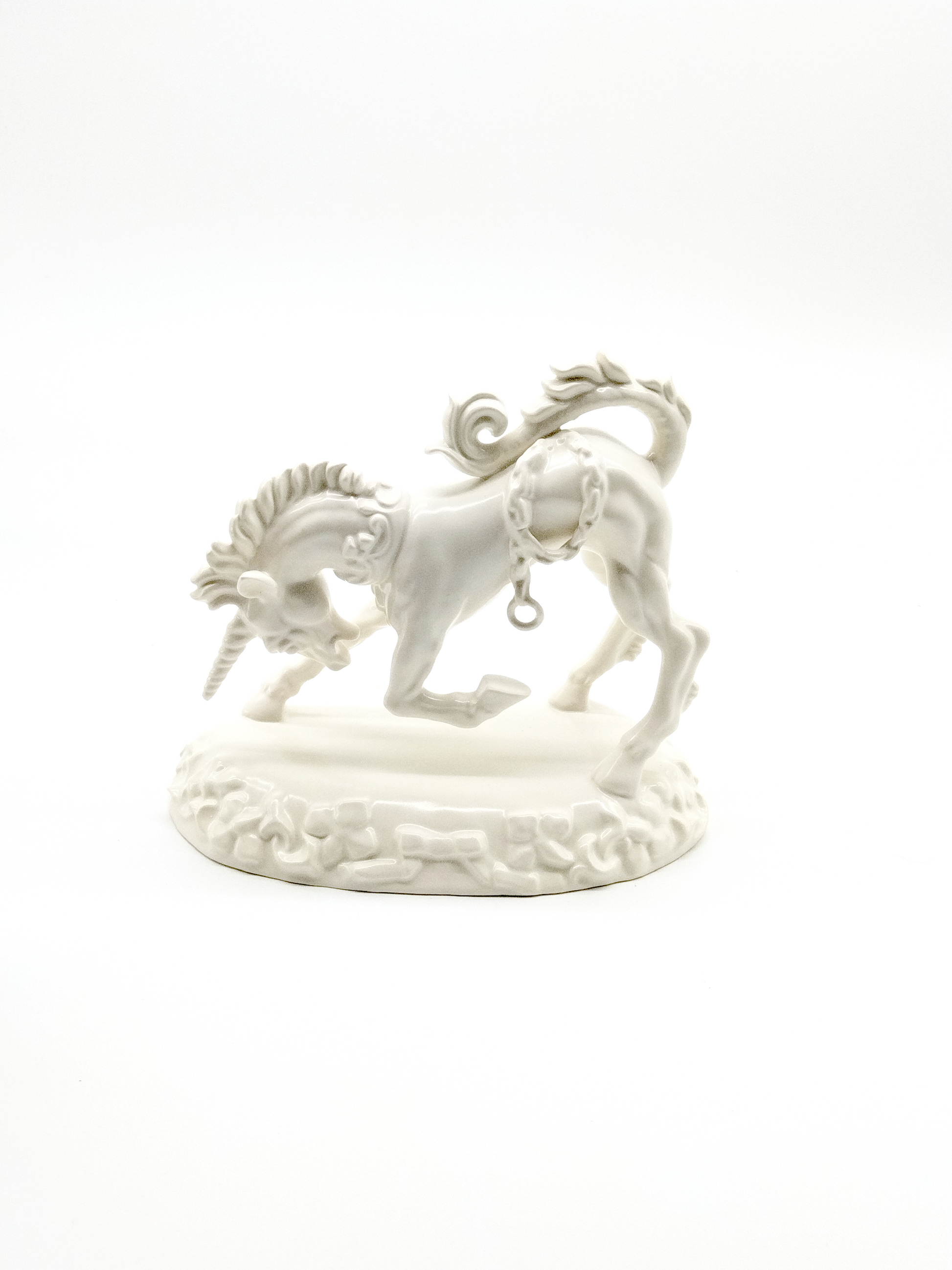 A RARE WEDGWOOD UNICORN FIGURE IN WHITE GLAZED CERAMIC, CIRCA 1950, 23 x 19cm.