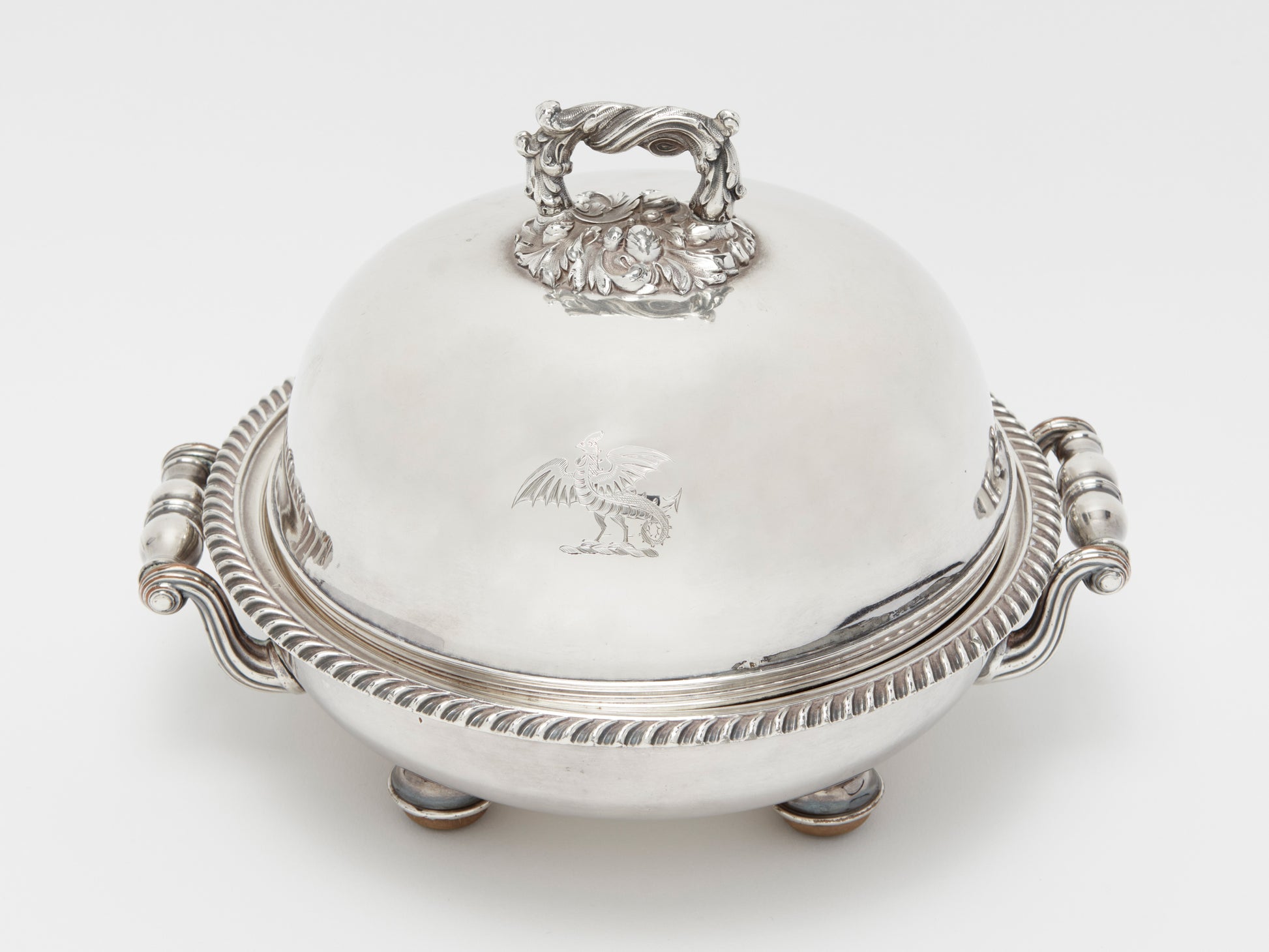 AN ANTIQUE MUFFIN DISH WITH ENGRAVED GRYPHON DECORATION
