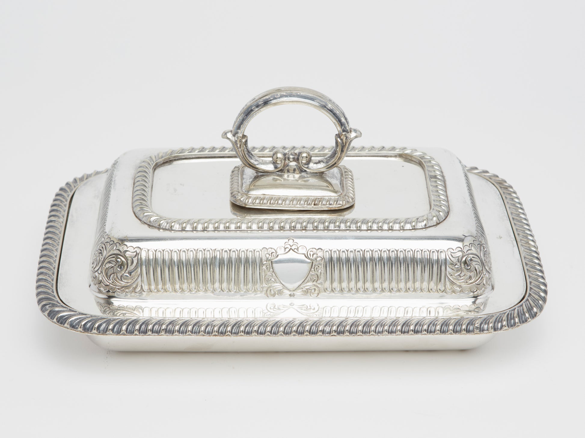 The silver plated tureen with reeded detail, scroll decoration and remove=able handle, 25 x 17 x 4cm. Circa 1900.