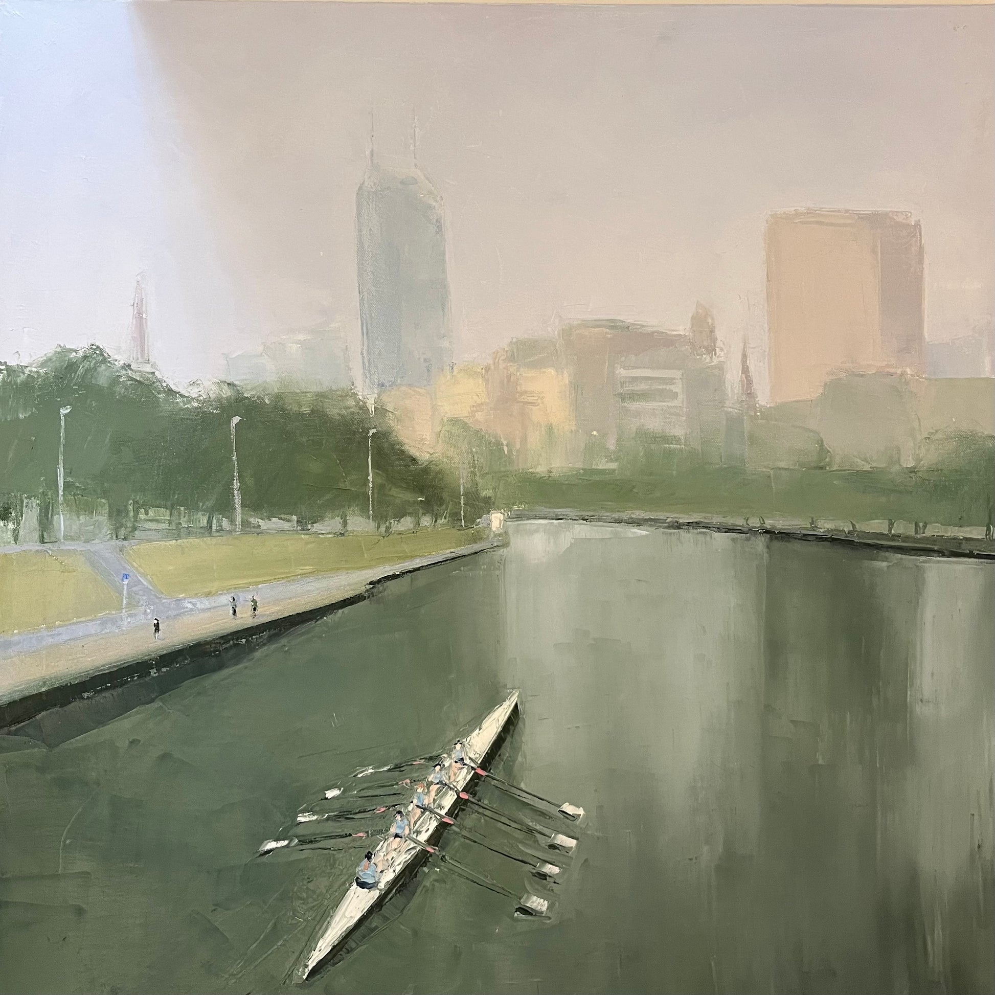 SALLY JOUBERT, ROWERS ON THE YARRA, OIL ON CANVAS, 2010, 70cm SQUARE.